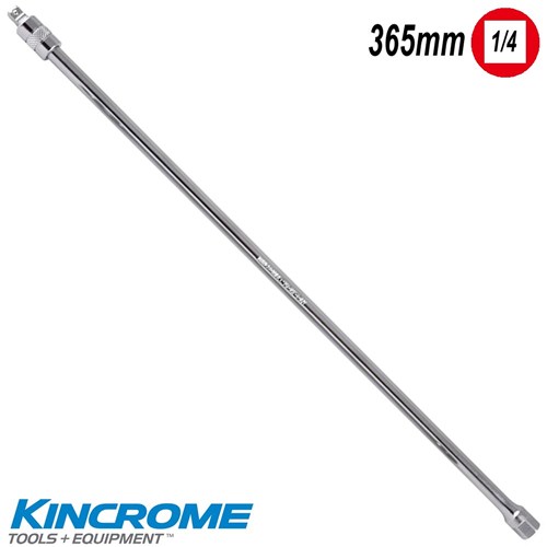 Kincrome LOK ON 1/4" Extension Bar, 365mm Long. These LOK ON Extension Bars are designed to allow access in difficult to reach areas with added features such as a quick release coupler to hold the socket or accessory securely and a hex nut end that allows for the application of a wrench if additional torque is required. These extension bars can be used as either a conventional straight bar or as a wobble bar which provides 10 degrees of wobble for easier access. Manufactured from Chrome Vanadium Steel (CrV) with a mirror and machine satin finish for corrosion protection.