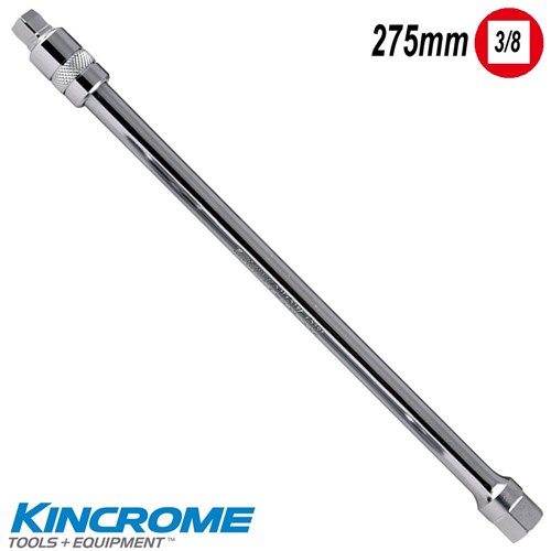 Kincrome LOK ON 3/8" Extension Bar, 275mm Long. These LOK ON Extension Bars are designed to allow access in difficult to reach areas with added features such as a quick release coupler to hold the socket or accessory securely and a hex nut end that allows for the application of a wrench if additional torque is required. These extension bars can be used as either a conventional straight bar or as a wobble bar which provides 10 degrees of wobble for easier access. Manufactured from Chrome Vanadium Steel (CrV) with a mirror and machine satin finish for corrosion protection.