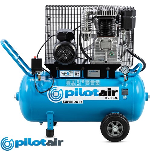 Pilot Air SUPERDUTY Australian designed and built portable belt drive air compressor. Free Air Delivery of 289 Litres per minute, 2.25KW (3.0Hp) 240 volt 15 amp motor.Features an Italian Twin Vertical Pump and Teco Motor. Finished with an industrial grade hammertone finish. Electric motor has overload protection. Warranty is 3 Years on pumps and 1 year on all other components.