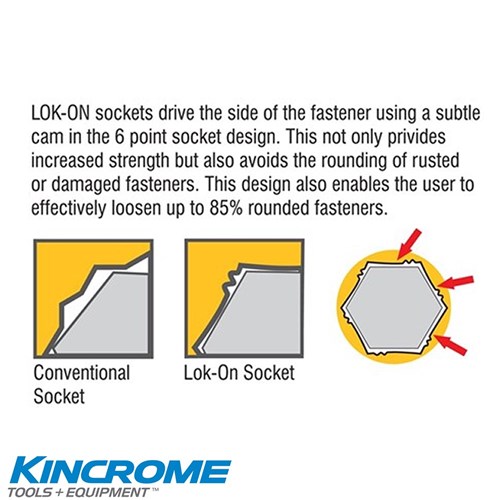 Kincrome LOK ON 1/2" Drive Imperial and Metric Standard Socket Set, 41 Piece. These LOK ON sockets offer unique patented features such as the ability to loosen up to 85% rounded and damaged fasteners, a subtle cam integrated with the LOK ON grooves which prevents further rounding and a kurled finger grip for speed on loose fasteners. Set contains;
