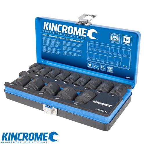 Kincrome's range of Impact Socket Sets are crafted from tough Chrome Molybdenum (Cr-Mo) and are finished in black phosphate for protection against all corrosion. The peripheral drive technology enables the easy identification of socket drive sizes, as well as providing greater surface area contact.