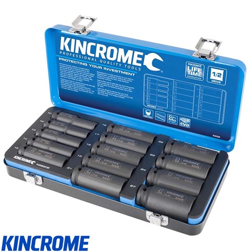 The Kincrome Deep Impact Socket Set features 14 1/2" drive metric pieces, crafted from Chrome Molybdenum (Cr-Mo). Featuring black phosphate for increased protection, laser etching for drive size identification and increased torque for round off prevention.