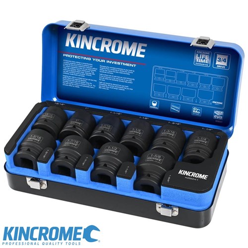 The Kinrome 3/4 Drive Impact Imperial Socket Set is designed for use with high powered, torque pneumatic power tools. The Socket Set is crafted from Chrome Molybdenum (Cr-Mo), hardened and tempered for increased performance in the harshest conditions.
