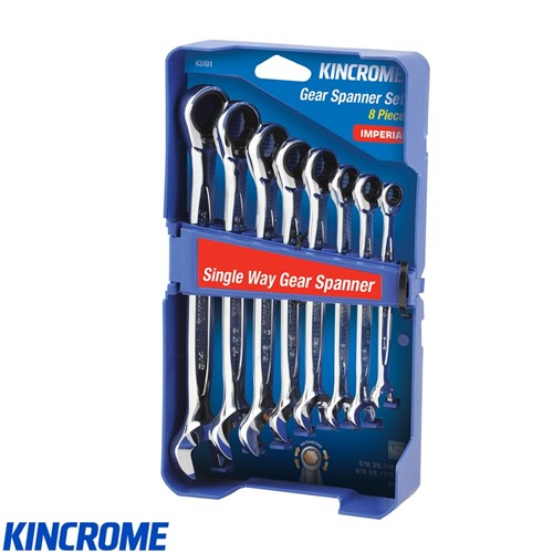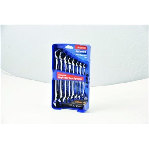 Kincrome 8 Piece Single Way Gear Spanner Set. With a 0 degree offset, the Gear ring head has directional arrows on both sides indicating either forward or reverse direction. The ratcheting ring feature allows increased working speed, eliminating the need to remove the spanner from the fastener after each turn. To change direction simply turn the spanner over. Set contains; Sizes: 5/16, 3/8, 7/16, 1/2, 9/16, 5/8, 11/16, 3/4". Packed in plastic case.