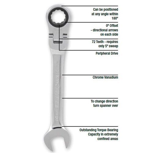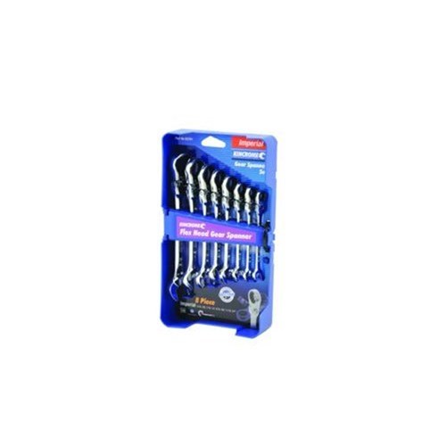 Kincrome 8 Piece Flex Head Gear Spanner Set. Provides outstanding torque bearing capacity while working in tight, confined areas. Can be positioned at a desired angle - within a 180 degrees range, allowing the user to reach fasteners on corners or in extremely angular locations. To change direction simply turn the spanner over. Conains Sizes: 5/16, 3/8, 7/16, 1/2, 9/16, 5/8, 11/16, 3/4". Packed in plastic holder.