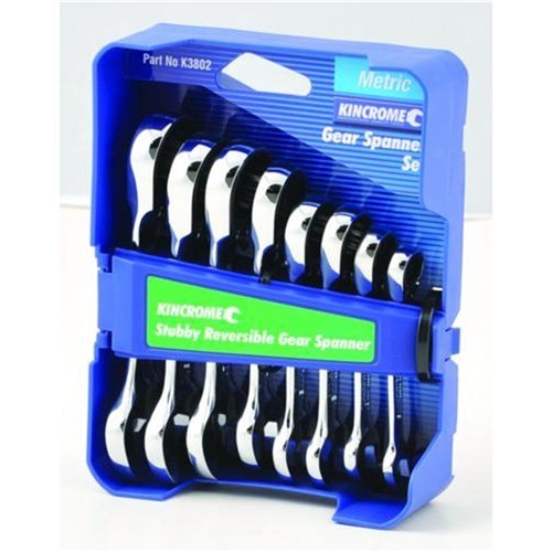 Kincrome 8 Piece Stubby Reversible Gear Ratchet Set. Gear Spanner allows you into places where other wrenches can't reach. Reverse Gear spanner has a 13 degree offset angle on the head, providing greater clearance in the working area for the user's fingers. Reverse switch eliminates the need to turn over the spanner when changing direction. Contains sizes: 8, 10, 12, 13, 14, 17, 18, 19mm. Packed in plastic holder.