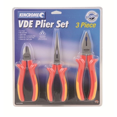 The KINCROME VDE 3 Piece Plier Set are insulated providing a rating of 1000 volts, manufactured from Chrome Vanadium Steel (CR-V) and feature a comfortable grip. Contents; 1 x 200mm Combination plier, 1 x 200mm Long nose plier and 1 x 150mm diagonal cutting plier.