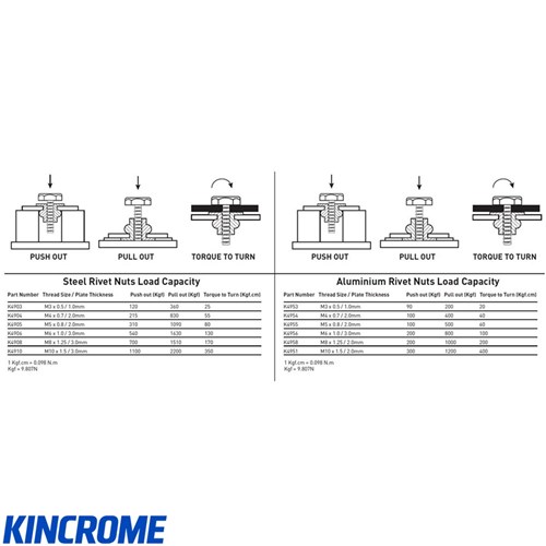 The KINCROME M8 Rivet Nut Insert is crafted from zinc-coated steel to offer superior durability and corrosion resistance. Designed to fit most popular nut riveters, including the K4900, these inserts are ideal for creating strong, reusable threads in metal sheets and other hard surfaces.