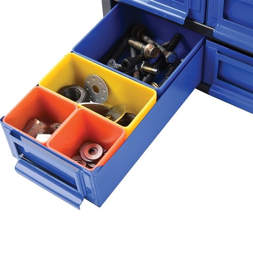 - 64 Removable Colour-Coded Storage Containers: 32 Small Orange Tubs, 16 Medium Yellow Tubs, and 16 Large Blue Tubs