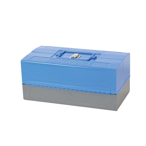 Kincrome Cantilever Tool Box with 5 trays. Made from heavy duty sheet steel, with UV stabilised gloss blue powder coated lids and grey hammertone base and interior trays. Features four internal, self-opening cantilever tool trays with concealed chrome stays and a large lower storage well with five EVA tray mats. Also features dual flush fitting, steel carry handles and a chrome pated hasp and staple. Measures 538mm x 280mm x 240mm.