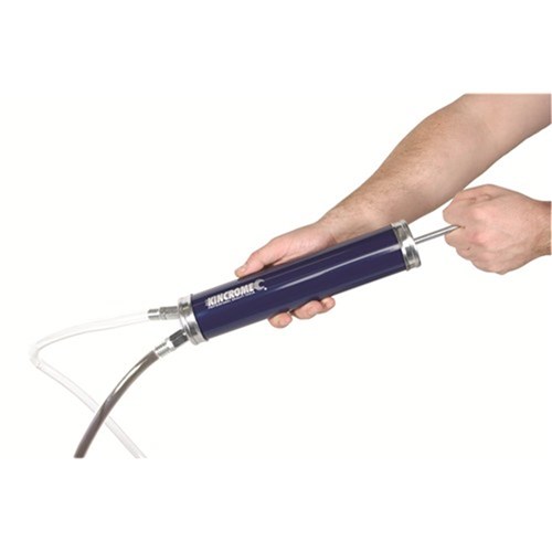Kincrome 500cc oil suction gun. Unique double action allows transfer of oil from container to equipment. Ideal fast and easy method for transferring transmission oils, gear oils, differential oils, etc. Features an Outlet Valve and an Inlet Valve for easy transfer in one pump. Comes with 2 x 1000mm Clear Flexible Hoses.