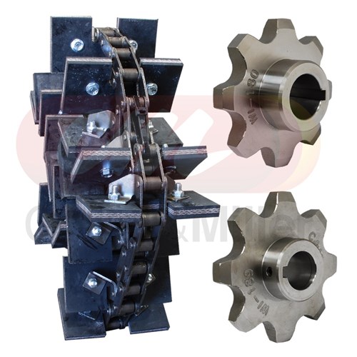 C&M aftermarket returns (tailings) chain and sprocket kit to fit the returns grain elevator on John-Deere® 9570STS model combine harvesters. This kit contain 1 x chain set including paddles and 1 x upper sprocket and 1 x lower sprocket.