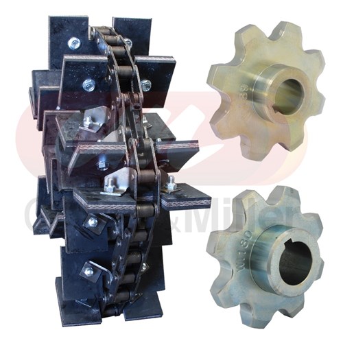 C&M aftermarket returns (tailings) chain and sprocket kit to fit the returns grain elevator on John-Deere® 9670STS model combine harvesters. This kit contain 1 x chain set including paddles and 1 x upper sprocket and 1 x lower sprocket.