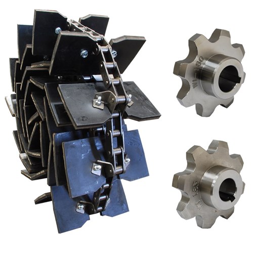 C&M aftermarket clean grain (main) chain and sprocket kit to fit the clean grain elevator on John-Deere® 9760STS model combine harvesters. This kit contain 1 x chain set including paddles and 1 x upper sprocket and 1 x lower sprocket.