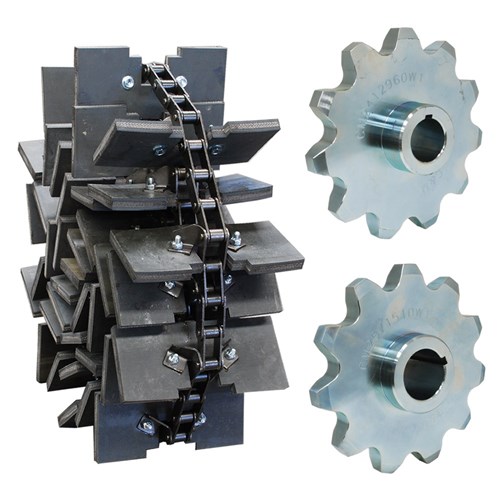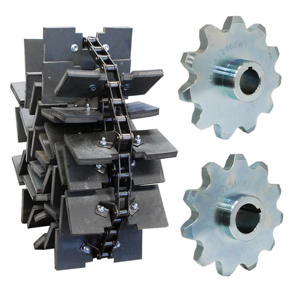 C&M aftermarket clean(main) grain chain assembly kit to fit Massey Ferguson® 9895 combine harvesters. This kit is supplied with 1 x chain assembly including paddles, 1 x top sprocket and 1 x bottom sprocket.