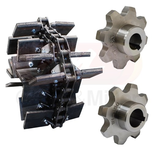 C&M aftermarket returns (tailings) chain and sprocket kit to fit the active tailings grain elevator on John-Deere® S790 model combine harvesters. This kit contain 1 x chain set including paddles and 1 x upper sprocket and 1 x lower sprocket.
