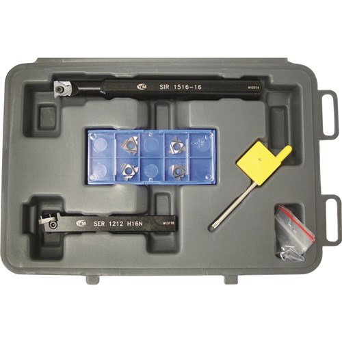 This internal/external threading kit will suit all lathes of 12mm tool height. Kit contains 1 internal threading tool, 1 external threading tool, 2 internal threading inserts (1 x 55 degrees and 1 x 60 degrees) and 2 external threading inserts (1 x 55 degrees and 1 x 60 degrees).