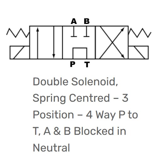 LC1A Solenoid operated directional valve. Double solenoid, spring centered - 3 Position - 4 way. P to T, A & B blocked in neutral.
