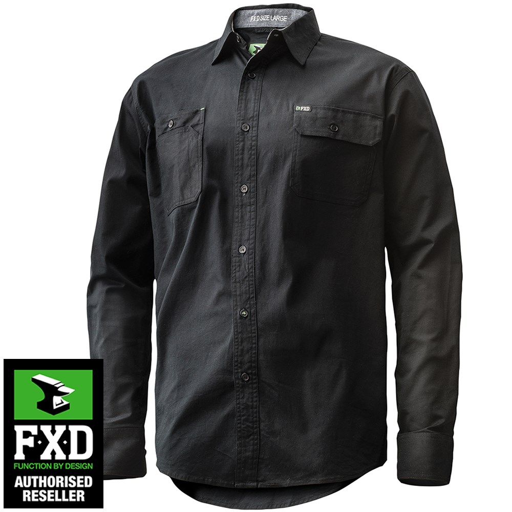 FXD Mens Stretch Long Sleeve Work Shirt, Black. These Shirts feature a tailored fit, roll sleeves, chambray trim lining, drop tail, dual pockets and triple needle seams. Made from 185gsm MV180 cotton. MV180 is a 360 Degree stretch cotton that combines movement and breathability to produce a superior function shirt fabric.