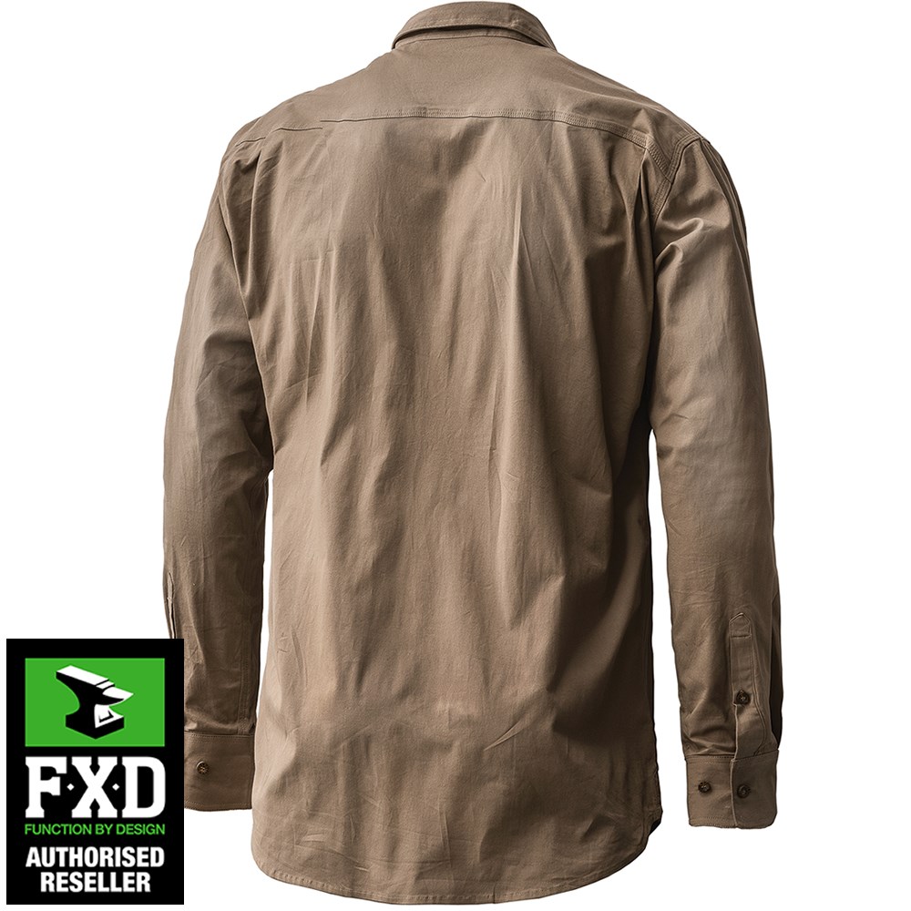 FXD Mens Stretch Long Sleeve Work Shirt, Khaki. These Shirts feature a tailored fit, roll sleeves, chambray trim lining, drop tail, dual pockets and triple needle seams. Made from 185gsm MV180 cotton. MV180 is a 360 Degree stretch cotton that combines movement and breathability to produce a superior function shirt fabric.