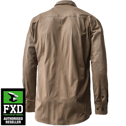 FXD Mens Stretch Long Sleeve Work Shirt, Khaki. These Shirts feature a tailored fit, roll sleeves, chambray trim lining, drop tail, dual pockets and triple needle seams. Made from 185gsm MV180 cotton. MV180 is a 360 Degree stretch cotton that combines movement and breathability to produce a superior function shirt fabric.