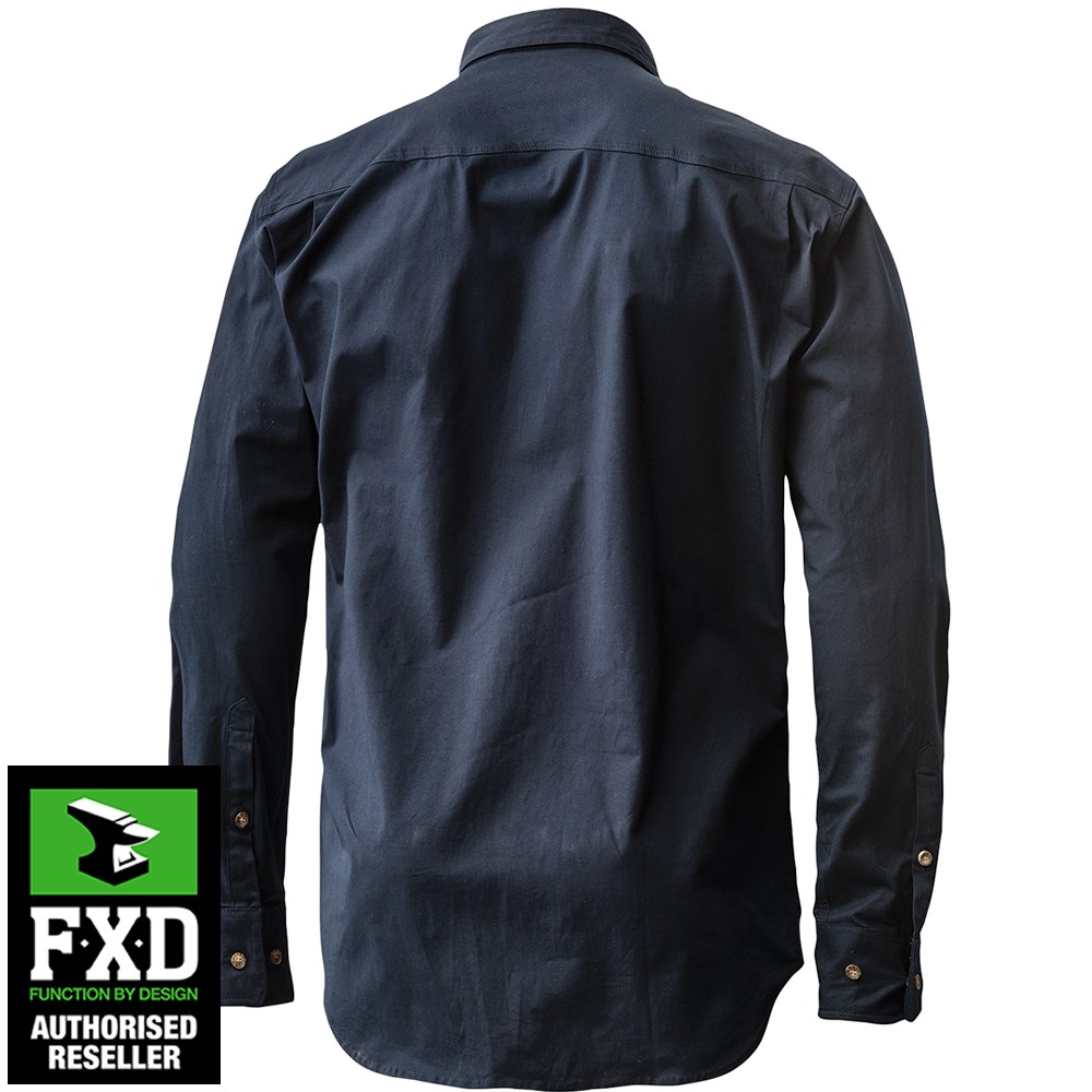 FXD Mens Stretch Long Sleeve Work Shirt, Navy. These Shirts feature a tailored fit, roll sleeves, chambray trim lining, drop tail, dual pockets and triple needle seams. Made from 185gsm MV180 cotton. MV180 is a 360 Degree stretch cotton that combines movement and breathability to produce a superior function shirt fabric.