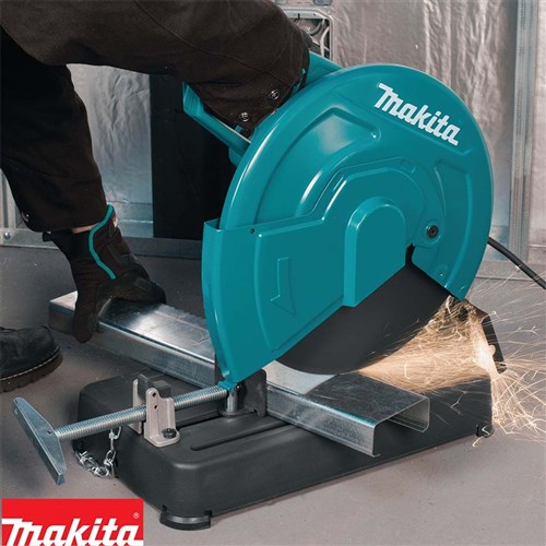 The Makita 355mm Abrasive Cut-Off Saw is built for powerful and efficient cutting of a wide range of materials. With a cutting capacity of up to 115x130mm in height, 70x233mm in width, and a 127mm diameter, it handles large and small projects with ease. Featuring on-board tool storage for the wheel and guide plate adjustment, it ensures everything you need is within reach. Powered by a high-performance 2,400W motor (continuous rating input), this saw delivers consistent cutting power. The quick-release clamp secures stock for fast, repetitive cuts, while the D-shape handle offers easy and comfortable gripping.
