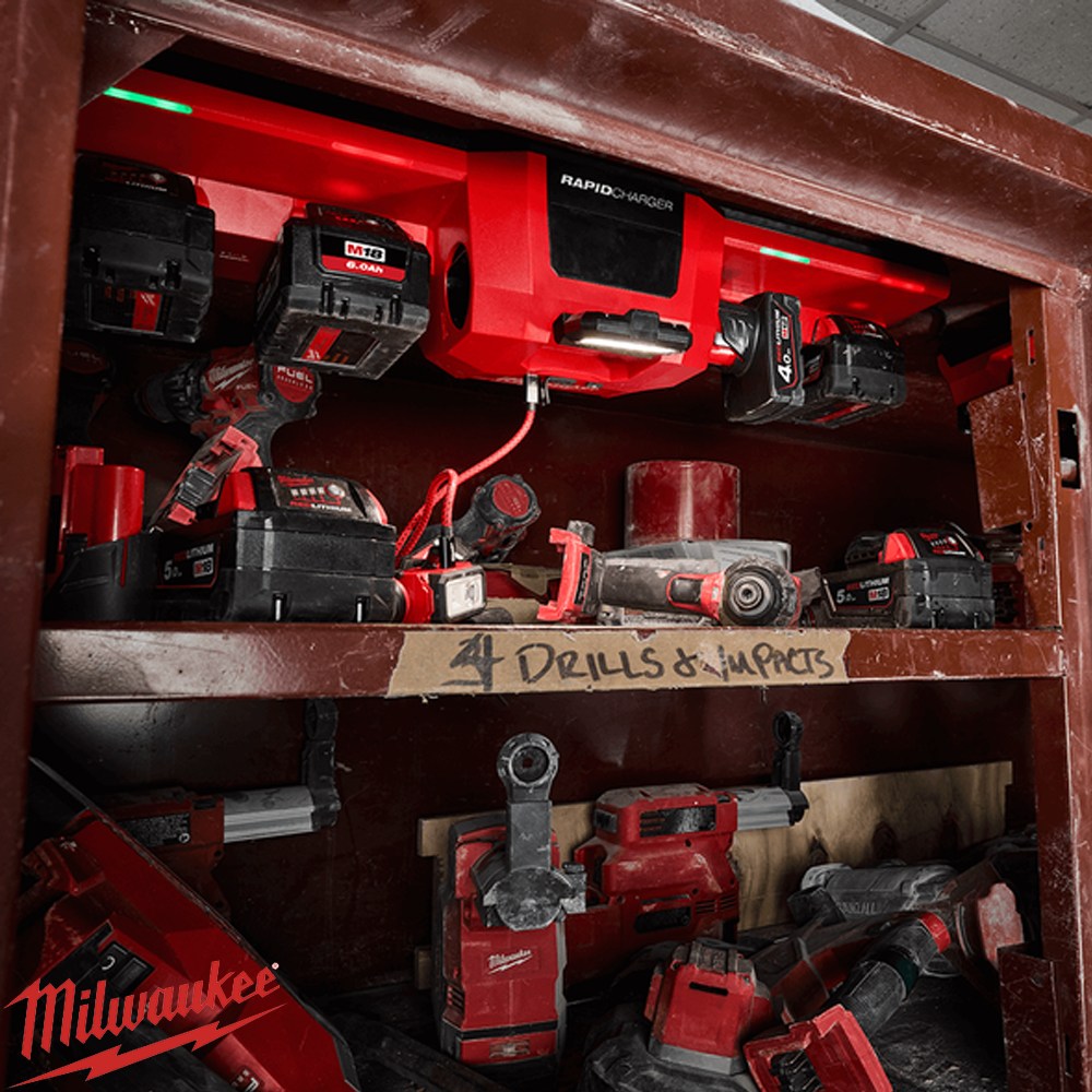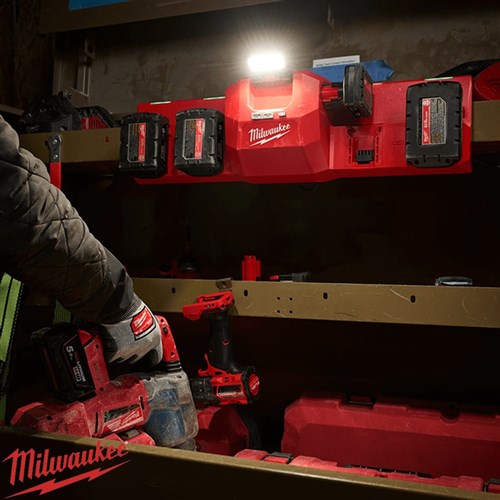 The Milwaukee M12™ & M18™ Site Box Rapid Charger is designed for tradespeople working on commercial job sites who need fast, reliable battery charging directly from site boxes or steel storage units. This charger can simultaneously charge two batteries at a rapid rate while automatically moving to the next pair, minimising downtime. Equipped with a 450-lumen TRUEVIEW™ LED light with 270° rotation, it provides bright illumination for site boxes, making it easier to locate tools and supplies. With a strong magnetic base, cleat, and multiple mounting options, it maximises storage space while keeping batteries and small devices powered efficiently.