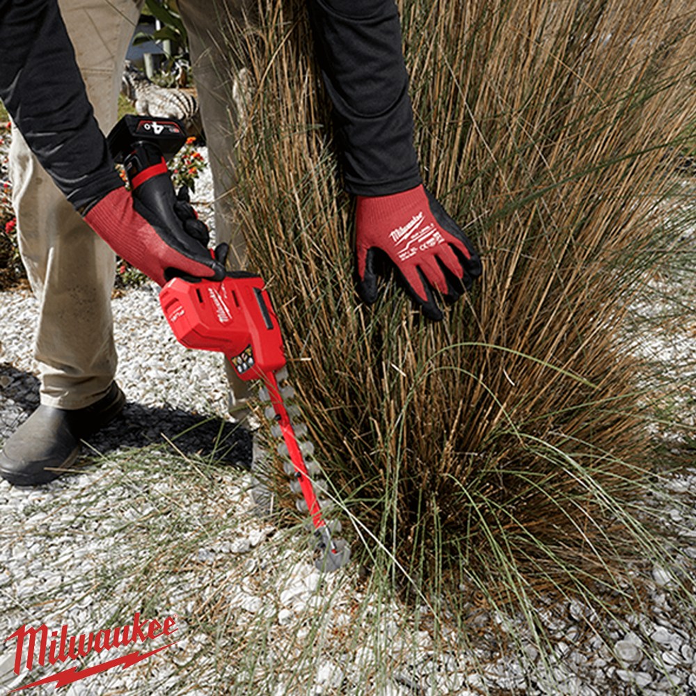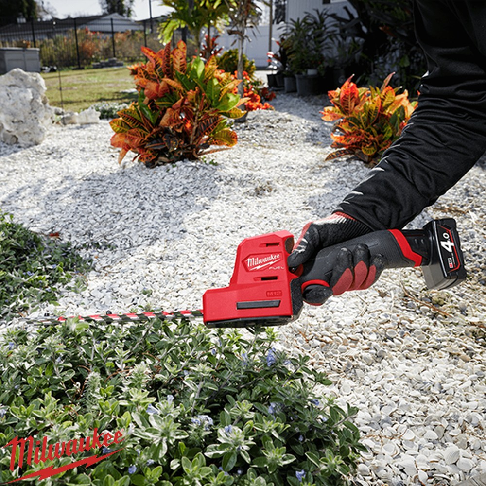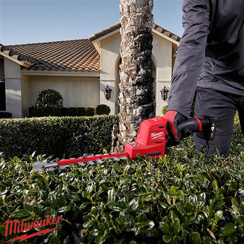 The Milwaukee M12 FUEL™ Hedge Trimmer is a compact, lightweight solution for precision trimming in landscaping and garden maintenance. Designed for professional and home use, its ergonomic design allows one-handed operation in tight spaces while maintaining full control. Powered by a POWERSTATE™ Brushless Motor, it delivers 2,700 SPM for fast cutting of branches up to 13mm thick. The trimmer features a blade tip guard to protect both the blades and nearby property, an onboard fuel gauge, and a hang hole for convenient storage. Compatible with over 200 tools in the M12™ system, this tool combines versatility, durability, and professional-grade performance.