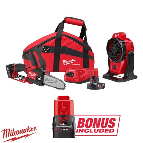The Milwaukee M12 FUEL™ 2 Piece Power Pack 2OPA is the perfect kit for professionals looking to handle demanding landscape tasks and maintain comfort on the jobsite. This power pack features the M12 FUEL™ Hatchet™ 6" (152mm) Pruning Saw, which delivers precision control and access while cutting through hardwoods up to 3" (76mm) thick. It provides up to 120 cuts per charge, meeting the needs of landscape maintenance pros. The kit also includes two M12 REDLITHIUM-ION™ 6.0Ah batteries that provide extended runtime, exceptional power, and durability, even in extreme conditions. Additionally, the M12™ Mounting Fan ensures optimal air circulation with speeds up to 23 km/h, offering versatile mounting options and up to 16 hours of runtime. The fan’s compact design and 360-degree head rotation make it easy to position for efficient cooling or ventilation. A durable pruning saw bag and a M12™ charger round out this versatile and performance-driven power pack.