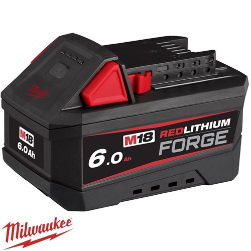 The M18™ REDLITHIUM™ FORGE™ 6.0Ah Battery offers high power in a smaller, ergonomic design with the longest lifespan compared to other REDLITHIUM™ batteries. It stands as Milwaukee’s most potent, quickest charging, and longest-lasting battery option. Its optimized balance of size, weight, and increased power makes it ideal for demanding overhead and confined workspaces.