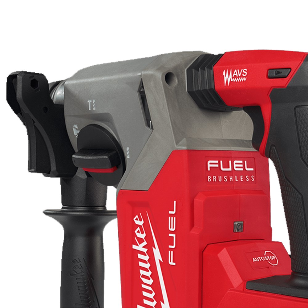 The MILWAUKEE M18 FUEL 26 mm SDS Plus Rotary Hammer includes AUTOSTOP Kickback Control for maximum control and enhanced safety, with the tool sensing a bind-up situation when users are drilling in rebar or hard aggregate and stopping over-rotation, without the need for the user to release the trigger, indicated by the AUTOSTOP Indicator LED.