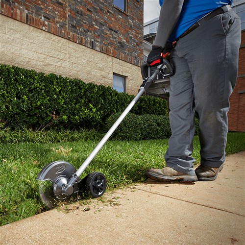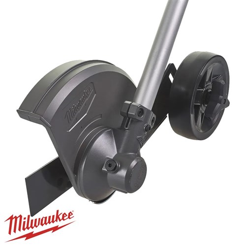 The M18 FUEL Edger Attachment, compatible with the M18 FUEL Outdoor Power Head (sold separately) and our Attachment System, features a 203mm (8") blade with a high-strength guard for durability. Equipped with mud flaps to prevent dirt kickback, a skid plate for gearbox protection, and an adjustable wheel for optimal blade depth and tool angle, it provides maximum control. The QUIK-LOK Attachments have protected drive shafts for increased durability. Additionally, the edger utilizes optimized gearing to manage the cordless M18 FUEL Outdoor Power Head RPM output specifically for edging applications.