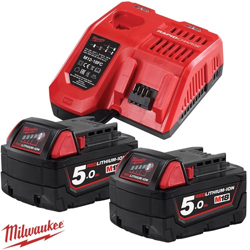 - Includes two M18™ REDLITHIUM™ 5.0Ah Batteries and M12™ & M18™ Rapid Charger in a moulded case