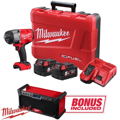 Get the job done with the Milwaukee M18 FUEL™ 2 Piece Power Pack 2AT2BD. This kit includes the powerful M18 FUEL™ 1/2" High Torque Impact Wrench with Friction Ring, a rapid M12™ & M18™ charger, and two M18™ REDLITHIUM™ 5.0Ah batteries. As a bonus, enjoy the M18™ Bluetooth Jobsite Radio DAB+ for premium sound on the go.