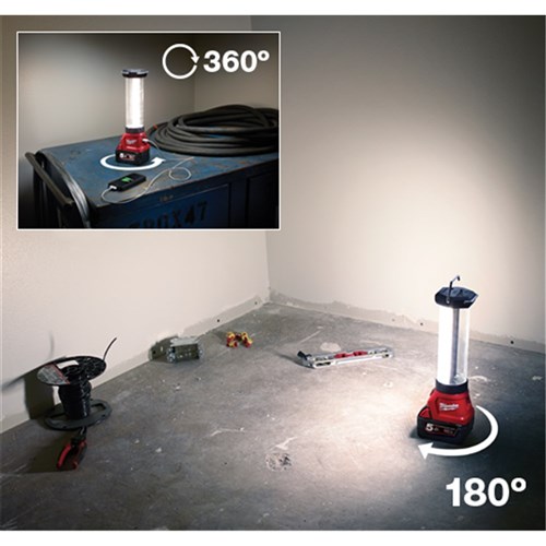 Milwaukee 18V LED Lantern/ Flood Light. TOOL ONLY. This Light has a rugged design with an impact resistant lens, designed to withstand 2 meter drops. Features a 180 Degree - 360 Degree adjustable beam and four lightsettings which allows the userto select between area and task lighting. Unmatched lightoutput with 700 Lumens. Also features two stainless steel hooks that are designed to be used as a hook or a handle and a 2.1A USB charger for tablets, smart phones and other electronic devices. Battery and charger sold separately.