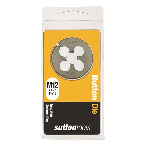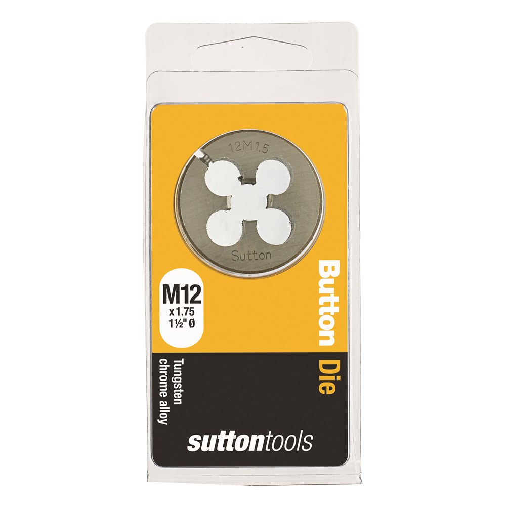 Sutton Carbon Button Dies, Metric Coarse, 1.5" OD. A Button Die is used for cutting a new male/external thread on studs. Made from Tungsten Chrome Alloy these Button Dies and are not suitable for precision, safety or critical thread but are ideal for general purpose and DIY use in non-ferrous metals & plastics.This solid round die fits into an adjustable guide or plain dies stock handle.