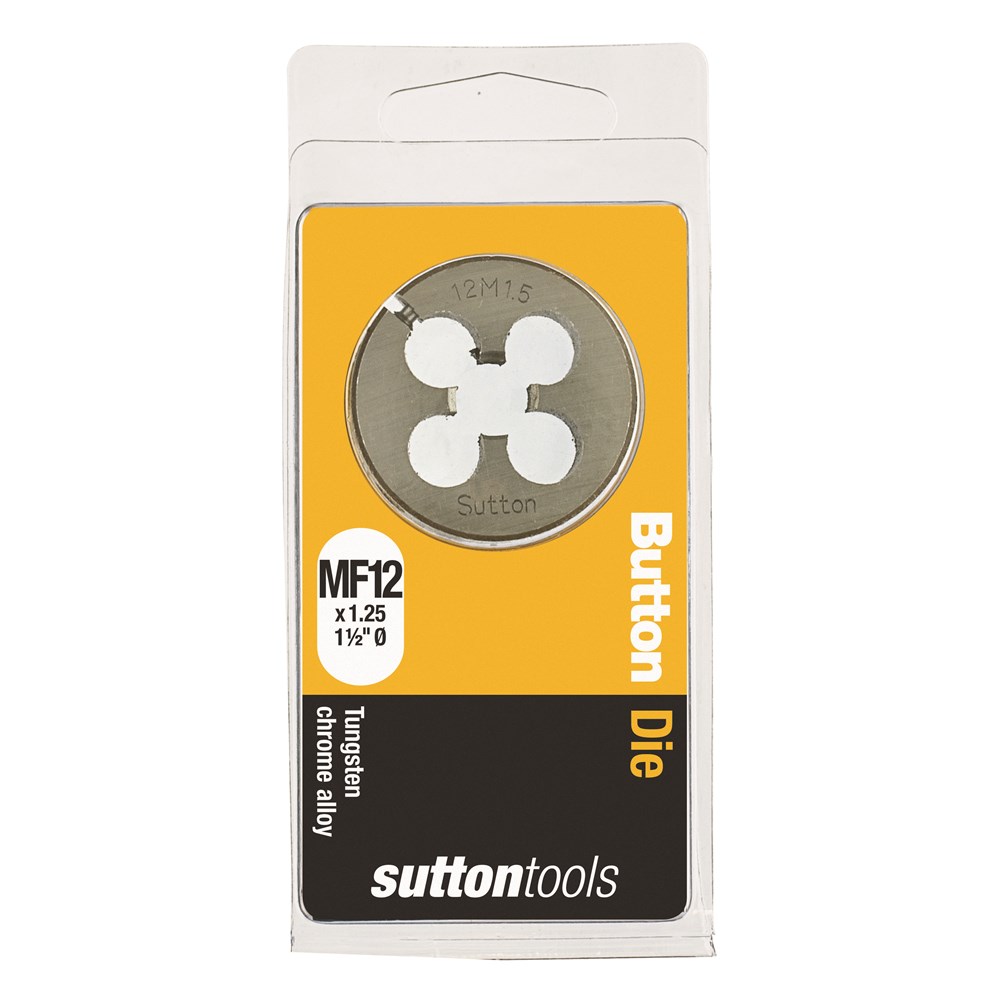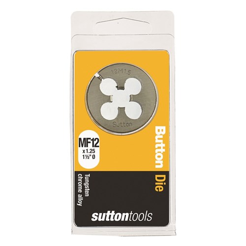 Sutton Carbon Button Dies, Metric Fine, 1.5" OD. A Button Die is used for cutting a new male/external thread on studs. Made from Tungsten Chrome Alloy these Button Dies and are not suitable for precision, safety or critical thread but are ideal for general purpose and DIY use in non-ferrous metals & plastics. This solid round die fits into an adjustable guide or plain dies stock handle.