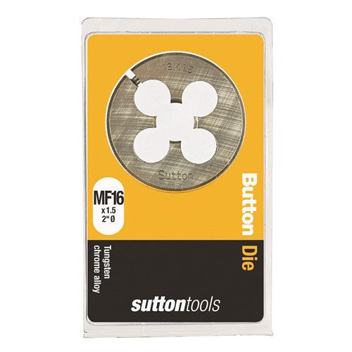 Sutton Carbon Button Dies, Metric Fine, 2" OD. A Button Die is used for cutting a new male/external thread on studs. Made from Tungsten Chrome Alloy these Button Dies and are not suitable for precision, safety or critical thread but are ideal for general purpose and DIY use in non-ferrous metals & plastics. This solid round die fits into an adjustable guide or plain dies stock handle.