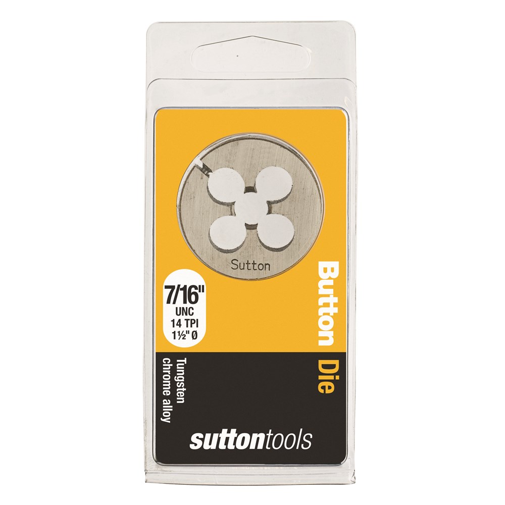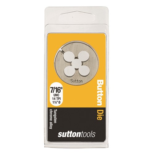 Sutton Carbon Button Dies, UNC, 1.5" OD. A Button Die is used for cutting a new male/external thread on studs. Made from Tungsten Chrome Alloy these Button Dies and are not suitable for precision, safety or critical thread but are ideal for general purpose and DIY use in non-ferrous metals & plastics. This solid round die fits into an adjustable guide or plain dies stock handle.