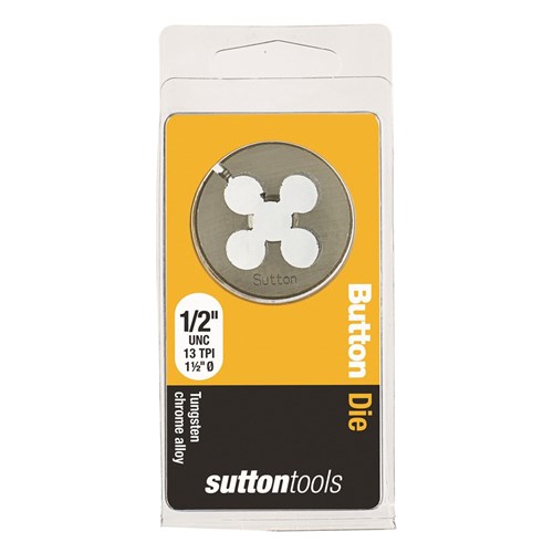 Sutton Carbon Button Dies, UNC, 1.5" OD. A Button Die is used for cutting a new male/external thread on studs. Made from Tungsten Chrome Alloy these Button Dies and are not suitable for precision, safety or critical thread but are ideal for general purpose and DIY use in non-ferrous metals & plastics. This solid round die fits into an adjustable guide or plain dies stock handle.