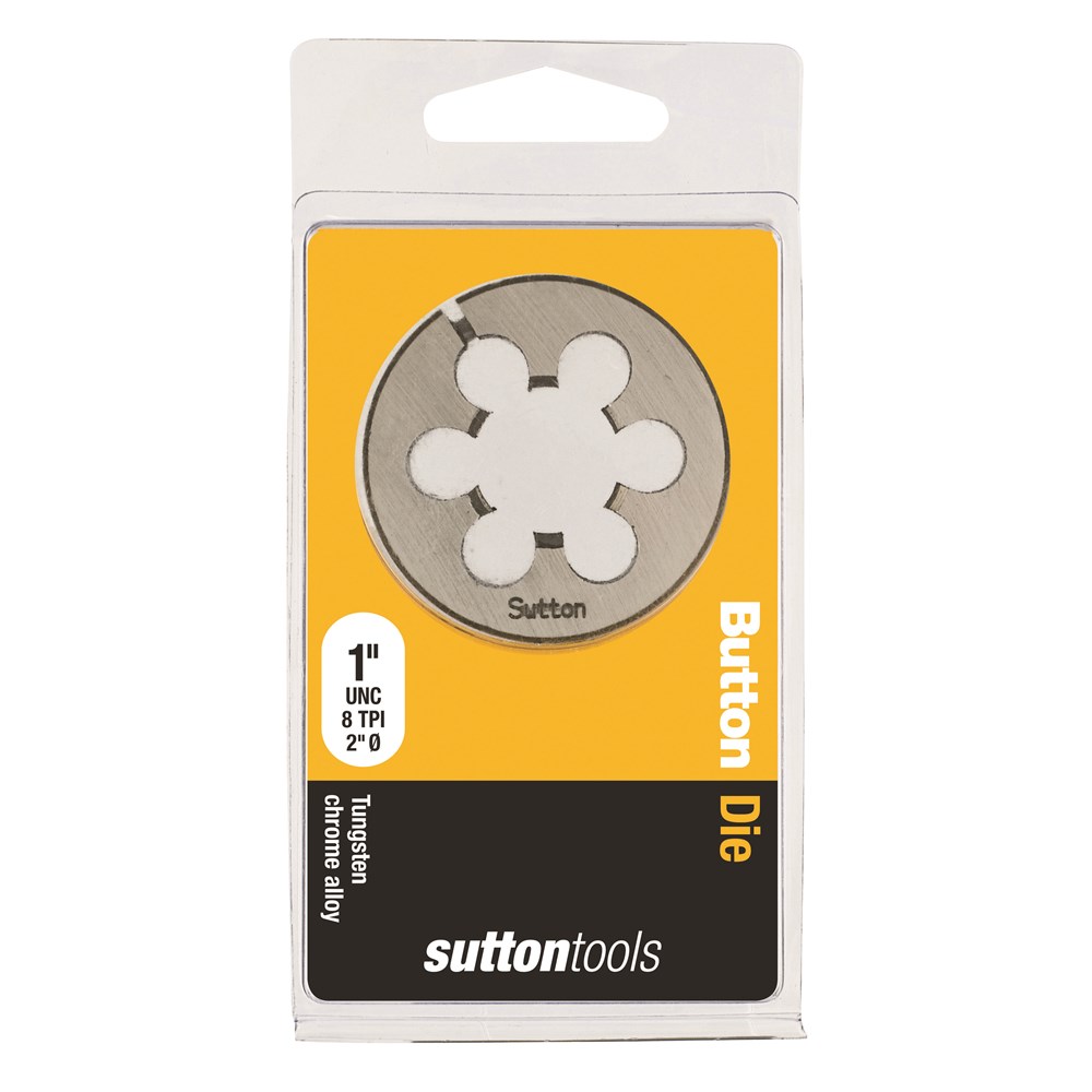 Sutton Carbon Button Dies, UNC, 2" OD. A Button Die is used for cutting a new male/external thread on studs. Made from Tungsten Chrome Alloy these Button Dies and are not suitable for precision, safety or critical thread but are ideal for general purpose and DIY use in non-ferrous metals & plastics. This solid round die fits into an adjustable guide or plain dies stock handle.
