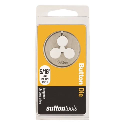 Sutton Carbon Button Dies, UNF, 1.5" OD. A Button Die is used for cutting a new male/external thread on studs. Made from Tungsten Chrome Alloy these Button Dies and are not suitable for precision, safety or critical thread but are ideal for general purpose and DIY use in non-ferrous metals & plastics. This solid round die fits into an adjustable guide or plain dies stock handle.