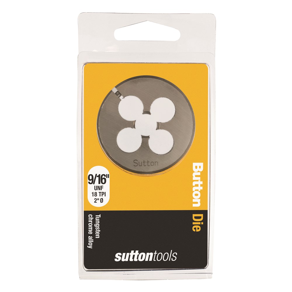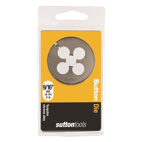 Sutton Carbon Button Dies, UNF, 2" OD. A Button Die is used for cutting a new male/external thread on studs. Made from Tungsten Chrome Alloy these Button Dies and are not suitable for precision, safety or critical thread but are ideal for general purpose and DIY use in non-ferrous metals & plastics. This solid round die fits into an adjustable guide or plain dies stock handle.