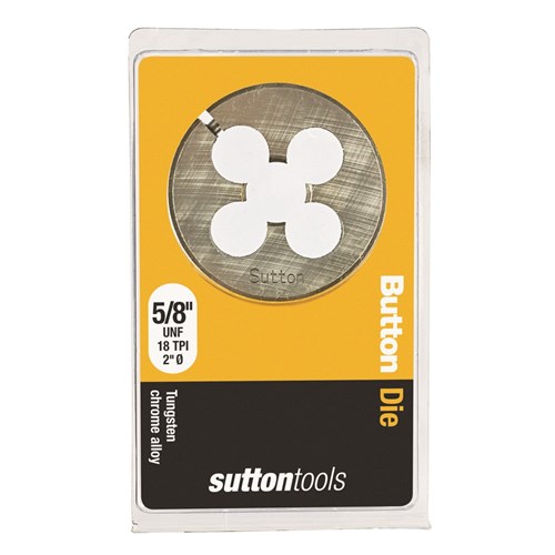 Sutton Carbon Button Dies, UNF, 2" OD. A Button Die is used for cutting a new male/external thread on studs. Made from Tungsten Chrome Alloy these Button Dies and are not suitable for precision, safety or critical thread but are ideal for general purpose and DIY use in non-ferrous metals & plastics. This solid round die fits into an adjustable guide or plain dies stock handle.