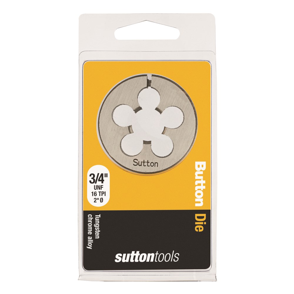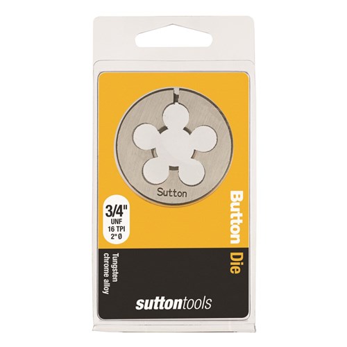 Sutton Carbon Button Dies, UNF, 2" OD. A Button Die is used for cutting a new male/external thread on studs. Made from Tungsten Chrome Alloy these Button Dies and are not suitable for precision, safety or critical thread but are ideal for general purpose and DIY use in non-ferrous metals & plastics. This solid round die fits into an adjustable guide or plain dies stock handle.