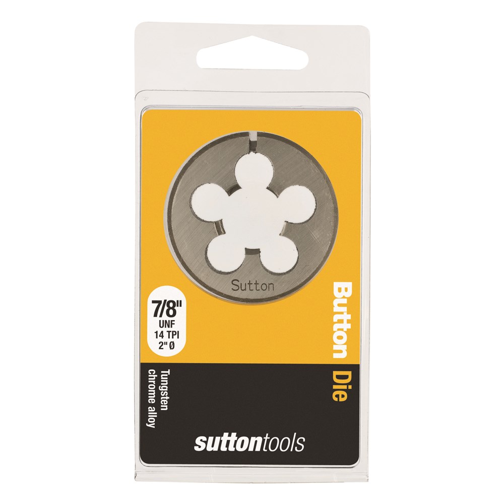 Sutton Carbon Button Dies, UNF, 2" OD. A Button Die is used for cutting a new male/external thread on studs. Made from Tungsten Chrome Alloy these Button Dies and are not suitable for precision, safety or critical thread but are ideal for general purpose and DIY use in non-ferrous metals & plastics. This solid round die fits into an adjustable guide or plain dies stock handle.