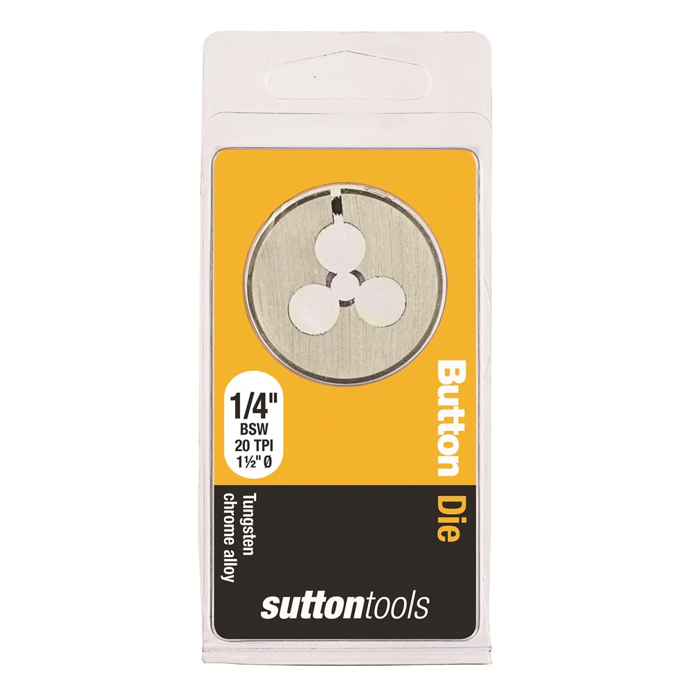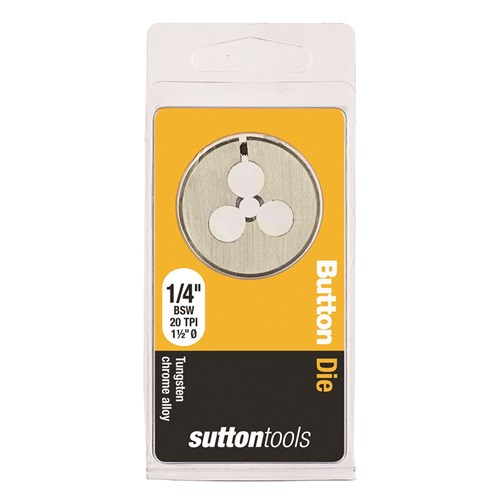 Sutton Carbon Button Dies, BSW, 1.5" OD. A Button Die is used for cutting a new male/external thread on studs. Made from Tungsten Chrome Alloy these Button Dies and are not suitable for precision, safety or critical thread but are ideal for general purpose and DIY use in non-ferrous metals & plastics. This solid round die fits into an adjustable guide or plain dies stock handle.