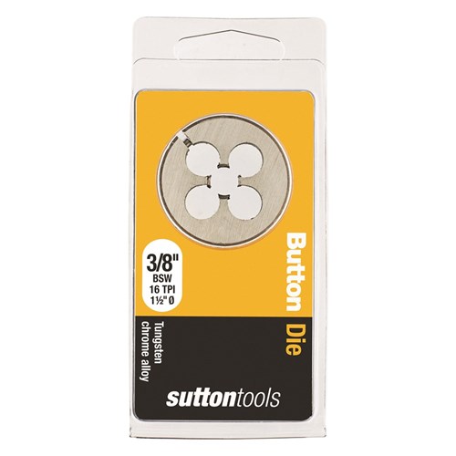 Sutton Carbon Button Dies, BSW, 1.5" OD. A Button Die is used for cutting a new male/external thread on studs. Made from Tungsten Chrome Alloy these Button Dies and are not suitable for precision, safety or critical thread but are ideal for general purpose and DIY use in non-ferrous metals & plastics. This solid round die fits into an adjustable guide or plain dies stock handle.
