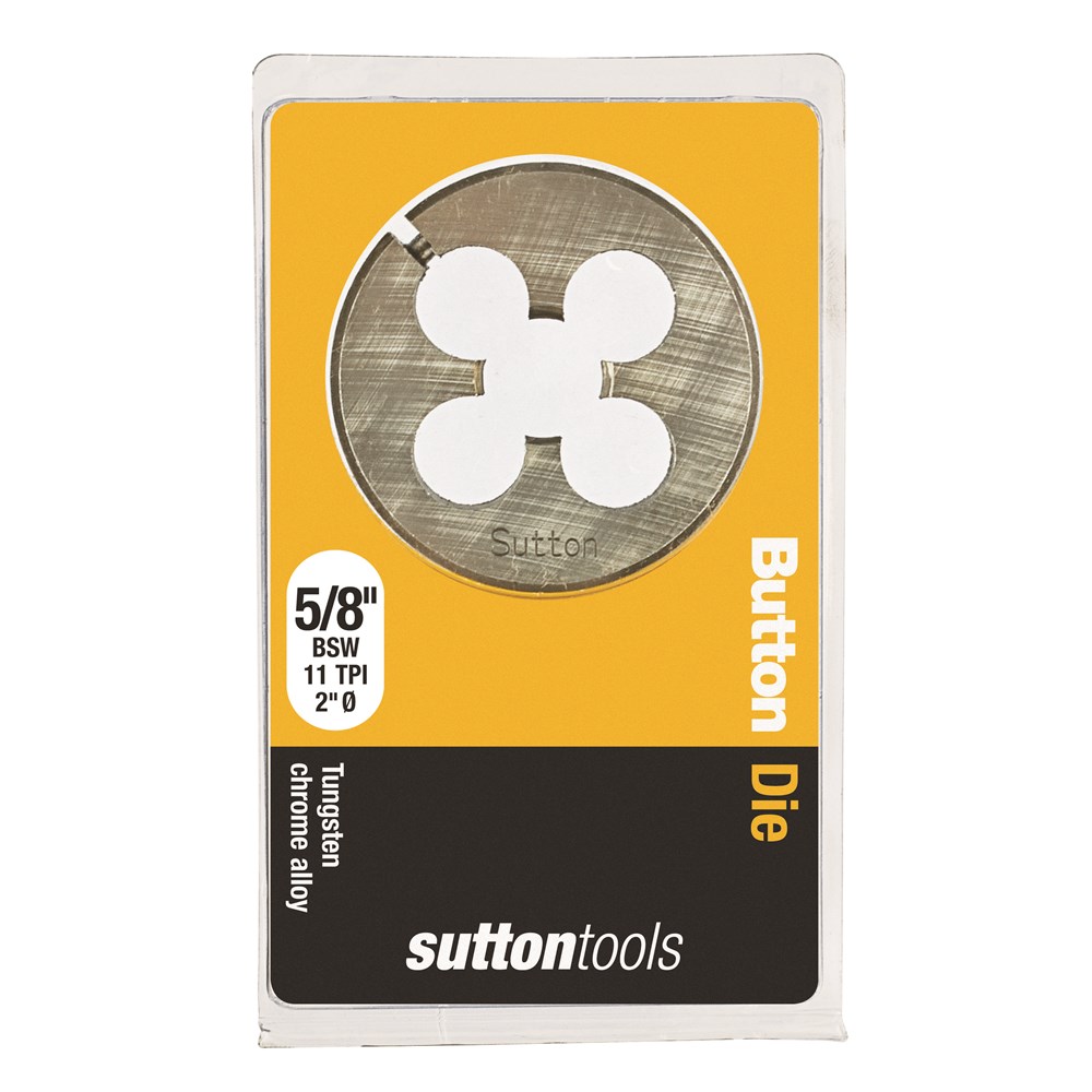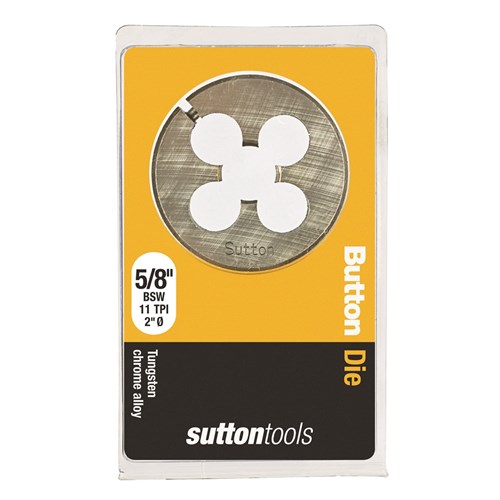 Sutton Carbon Button Dies, BSW, 2" OD. A Button Die is used for cutting a new male/external thread on studs. Made from Tungsten Chrome Alloy these Button Dies and are not suitable for precision, safety or critical thread but are ideal for general purpose and DIY use in non-ferrous metals & plastics. This solid round die fits into an adjustable guide or plain dies stock handle.